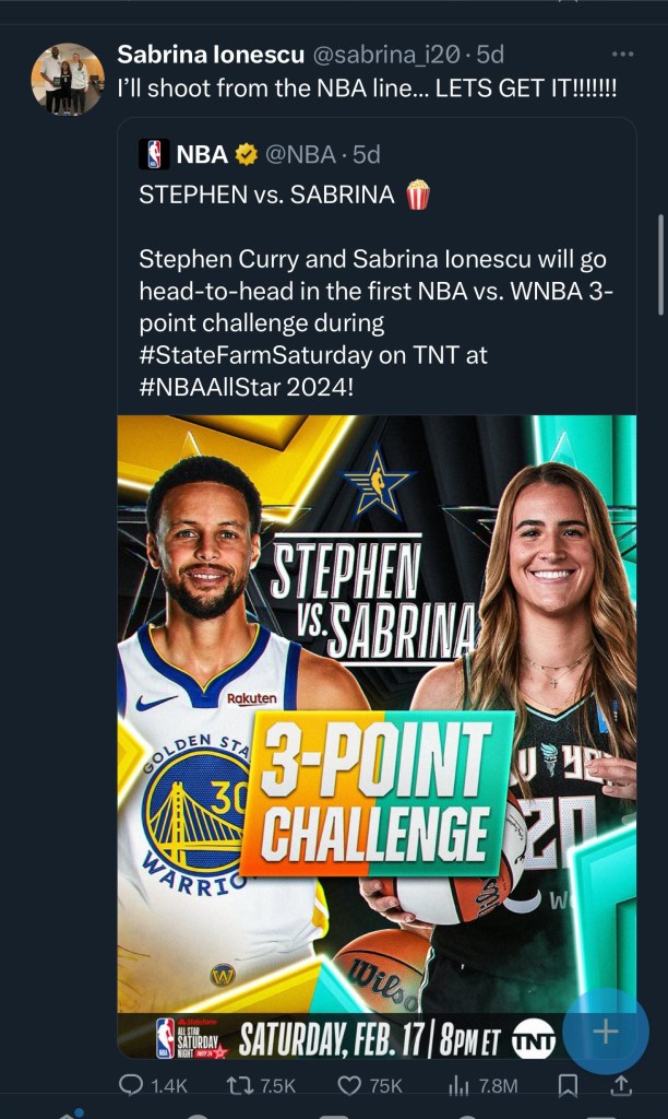 Did someone just say Sabrina Ionescu vs. Stephen Curry in a 3-Point Challenge? I think she just said, “challenge accepted” by this tweet.