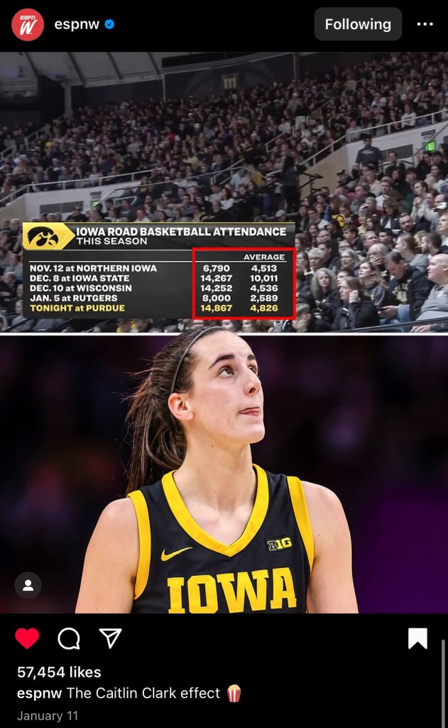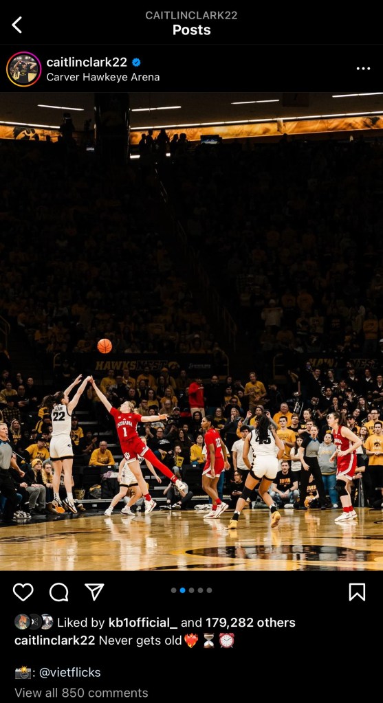 I have seen some absolutely insane highlights from several players but Caitlin Clark at Iowa and Juju Watkins at USC, have blown my mind this season. Caitlin Clark shoots from deep and the crowd goes nuts. A step back from the logo and the shot is good. Not only is her game impressive, but people are showing up to games to see her play and the numbers are above average in attendance. In a game against Purdue there was a crowd of 14,867 and the average for Iowa vs Purdue has typically been 4,826. ESPNW called this “The Caitlin Clark effect”. Clark is approaching the NCAA Division I women’s scoring record and needs 65 points to pass Kelsey Plum’s 3,527.